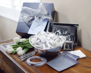 The blessings bowl takes this concept a step further. Using this bowl, attendees can take a piece of velum paper and jot down a prayer, a favorite Bible verse or a simple blessing. They then roll up the piece of velum, tie it with a lovely ribbon, and then place it in the bowl. The Bride and Groom then have this beautiful bowl full of blessings, prayers and good wishes to take home and treasure forever. What a gift!